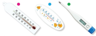 Термометр с розовой фишкой предназначен для измерения температуры воздуха. Термометр с голубой фишкой предназначен для измерения температуры воды.