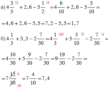 а) Чтобы выполнить вычисления, преобразуем смешанные числа в десятичные дроби, для этого приводим их дробные части к знаменателю 10, используя основное свойство дроби (умножив числитель и знаменатель дроби на дополнительный множитель так, чтобы в знаменателе получилось число 10). Затем выполняем вычисления с десятичными дробями.