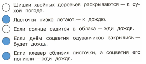 6. Используя дополнительную литературу, Интернет, допиши народные приметы, помогающие предсказывать погоду. Отметь (закрась кружок) те явления, которые тебе доводилось наблюдать в природе.