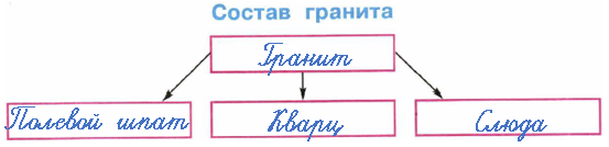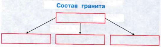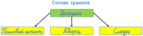 Закрашиваем в схеме прямоугольник с названием горной породы зелёным карандашом, прямоугольники с названиями минералов – жёлтым карандашом.
