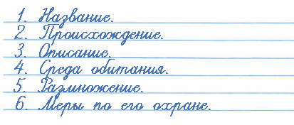 5. По заданию учебника подготовьте сообщение о любом растении или животном из Красной книги России. Воспользуйтесь общим планом рассказа о редком растении или животном. Запишите по пунктам плана основные сведения о нём.