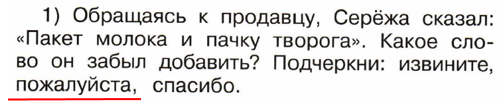 1) Обращаясь к продавцу, Серёжа сказал: "Пакет молока и пачку творога". Какое слово он забыл добавить? Подчеркни: извините, пожалуйста, спасибо.