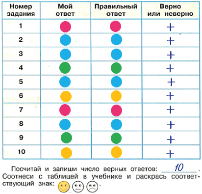 Выполняя задания учебника, заполняем таблицу. В столбце "Мой ответ" закрашиваем кружок в тот цвет, который, на наш взгляд, соответствует правильному ответу. В столбце "Правильный ответ" закрашиваем кружки так, как показано на "Страничках для самопроверки". Сравниваем эти два столбца и заполняем третий: если наш ответ правильный, ставим знак "+", если неправильный – знак "-".