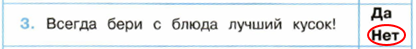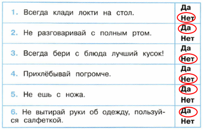 4. Попугай спешит посоветовать, как нужно вести себя за столом. Каким советам ты последуешь, а каким – нет? Обведи "Да" или "Нет".