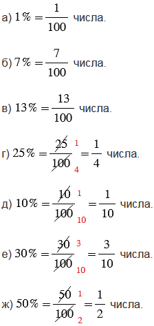 Величина, от которой вычисляются проценты составляет 100 своих сотых долей, т.е. 100 %. Тогда, чтобы определить, какую часть числа составляют несколько процентов, нужно составить дробь, у которой числитель - число, соответствующее нескольким процентам, а знаменатель - число 100. При необходимости, полученную дробь нужно сократить.