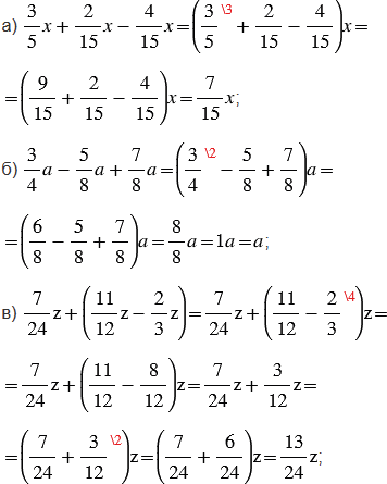 Чтобы упростить данные выражения, используем распределительное свойство умножения относительно сложения или относительно вычитаем, а именно выносим одинаковый множитель (букву) за скобки и выполняем вычисления в скобках по правилам, указанным ниже.