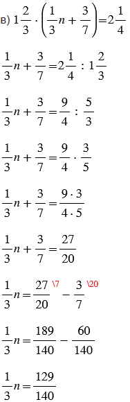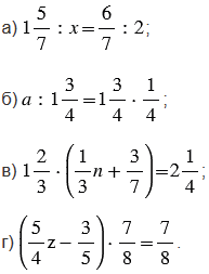 В пунктах в) и г) сначала решаем каждое уравнение относительно умножения, то есть находим неизвестный множитель (выражение в скобках), затем в пункте в) находим неизвестное слагаемое и далее снова находим неизвестный множитель, а в пункте г) находим неизвестное уменьшаемое и далее снова находим неизвестный множитель.