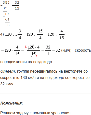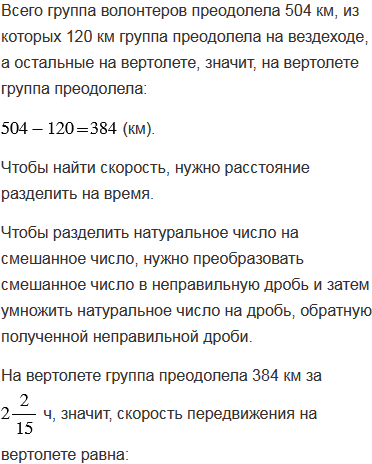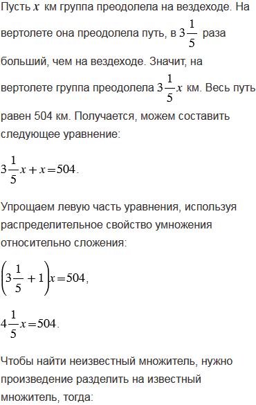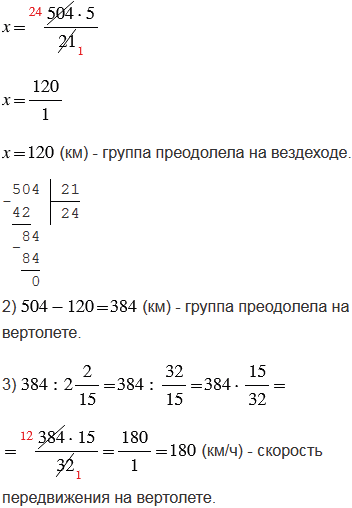 Группа волонтеров для уборки мусора на Крайнем Севере ч летела на вертолете, а затем еще ч ехала на вездеходе. При этом на вертолете она преодолела путь, в раза больший, чем на вездеходе. С какой скоростью группа передвигалась на вертолете и на вездеходе, если весь путь равен 504 км?