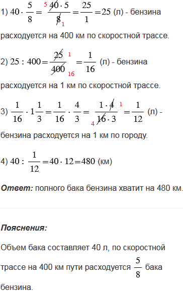 раза больше, чем при пробеге по скоростной трассе. На сколько километров хватит полного бака бензина объемом 40 л при движении по городу, если при движении по скоростной трассе на 400 км пути расходуется