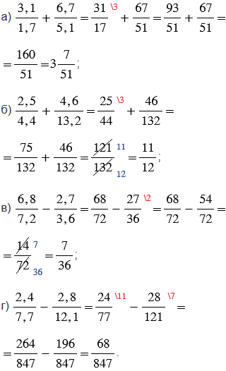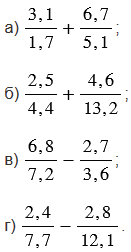 Чтобы выполнить сложение и вычитание дробных выражений представим их сначала в виде обыкновенных дробей, для этого в числителе и знаменателе каждого дробного выражения перенесем запятую вправо на одинаковое количество знаков так, чтобы в числителе и в знаменателе дробных выражений получились натуральные числа. А затем по правилам сложения и вычитания обыкновенных дробей выполним сложение и вычитание.