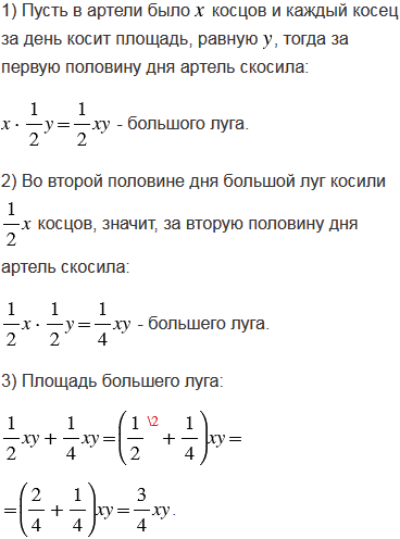 Артели косцов надо было скосить два луга, один вдвое больше другого. Половину дня артель косила большой луг. После этого артель разделилась пополам: первая артель осталась на большом лугу и докосила его к вечеру до конца; вторая же половина косила малый луг, на котором к вечеру еще остался участок, скошенный на другой день косцом за один день работы. Сколько косцов было в артели?