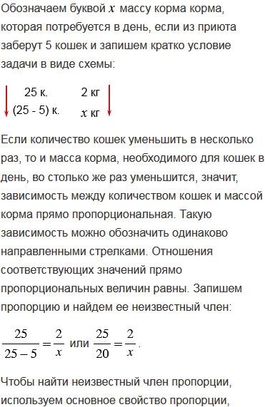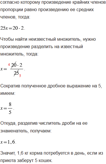 В приюте для животных на 25 кошек ежедневно расходуется 2 кг корма. Сколько корма потребуется в день, если из приюта заберут 5 кошек? (На каждое животное выделено одинаковое количество корма).