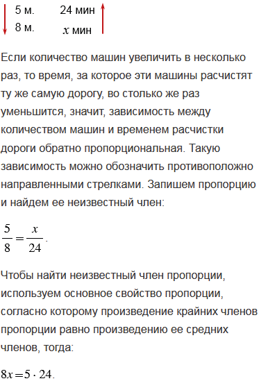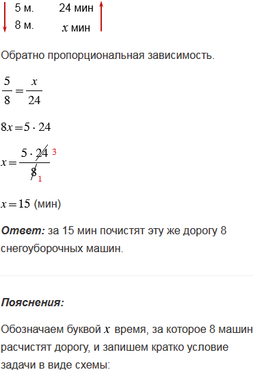 Пять снегоуборочных машин почистили дорогу за 24 мин. За какое время почистят эту же дорогу 8 снегоуборочных машин?