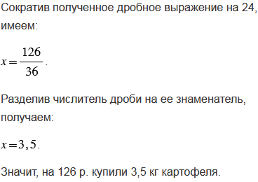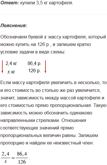 За 2,4 кг картофеля придется заплатить 86,4 р. Сколько купили картофеля, если за него заплатили 126 р.?
