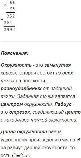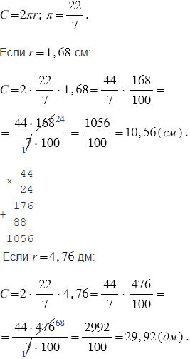 Чему равна длина С окружности, радиус которой равен: 1,68 см; 4,76 дм? Число считайте равным .