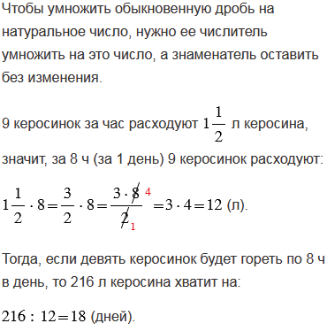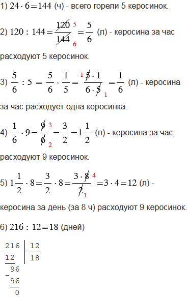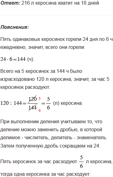 Задача А. П. Киселёва. На пять одинаковых керосинок, горевших 24 дня по 6 ч ежедневно, израсходовано 120 л керосина. На сколько дней хватит 216 л керосина, если девять таких же керосинок будет гореть по 8 ч в день?