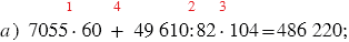 4) Если в выражении нет скобок и оно содержит сложение, вычитание, умножение и деление, то сначала выполняют умножение и деление по порядку слева направо, а потом сложение и вычитание также по прядку слева направо.
