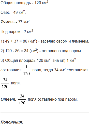 Посевная площадь аграрного комплекса равна 120 км2. Из них 49 км2 засеяно овсом, 37 км2 - ячменем, а остальная площадь оставлена под паром. Какая часть поля оставлена под паром?