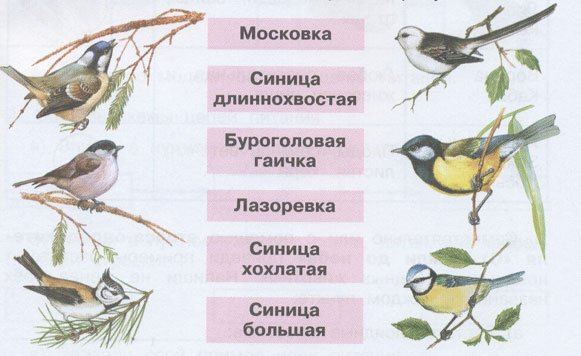 4. Это разные виды синиц. Определи их с помощью атласа-определителя "От земли до неба". Проведи стрелки от названий к соответствующим рисункам.