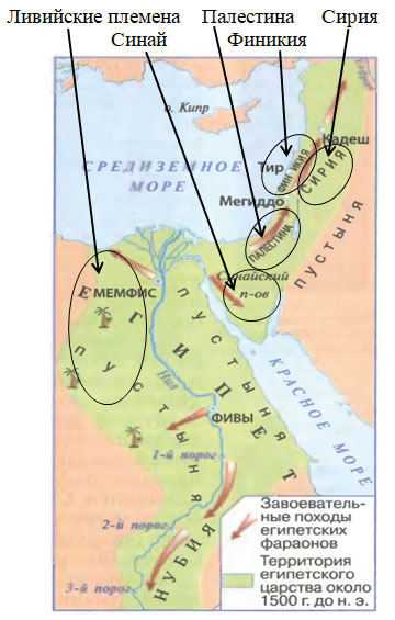 Поработайте с картой (см. с. 47). Найдите территорию Египетского царства при фараоне Тутмосе и соседние страны.