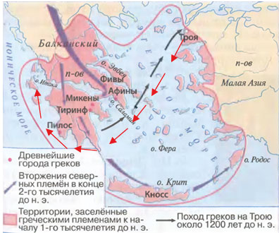 Кратчайший морской путь, который после падения Трои предстояло преодолеть Одиссею и его спутникам, обозначен красными стрелками.