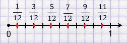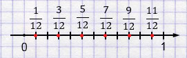 б) Чертим координатный луч и выбираем на нем единичный отрезок, равный 12 клеток. Далее делим единичный отрезок на 12 равных частей, т.е. по 1 клетке (т.к. 12 : 12 = 1). Далее отмечаем на этом луче точки с координатами