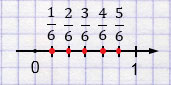 а) Чертим координатную прямую и выбираем на ней единичный отрезок, равный 6 клеток. Далее делим единичный отрезок на 6 равных частей, т.е. по 1 клетке (т.к. 6 : 6 = 1). Затем отмечаем на этой прямой точки с координатами