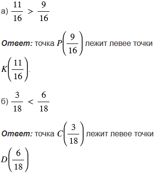 Точка на координатном луче, имеющая меньшую координату, лежит левее точки, имеющей большую координату. Следовательно, нам нужно сравнить координаты точек. При сравнении дробей опираемся на правило, согласно которому из двух дробей с одинаковыми знаменателями больше та, у которой числитель больше, и меньше та, у которой числитель меньше.