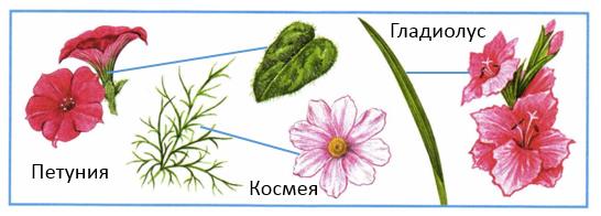 2. Узнай растения по их частям. Проверь себя с помощью рисунка учебника. После проверки соедини линиями листья растений с их цветками.