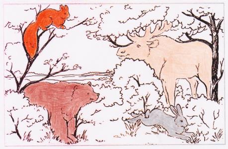 4. Здесь спрятались 4 разных зверя. Найди их и раскрась.