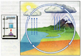 При длительном нагревании солнцем поверхности земли и водоёмов, вода постоянно расширятся. Промежутки между частицами воды сильно увеличиваются и она превращается в пар, который поднимается в небо. В вышине водяной пар остывает, превращается в мельчайшие капельки воды. Так образуются облака. Когда в облаках собирается много капель воды и они увеличиваются, облака превращаются в тучи. Когда капли тяжелеют, они выпадают на землю в виде дождя. Дождь питает землю влагой, наполняются водой водоёмы. Так происходит круговорот воды в природе.