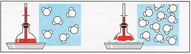 На первом рисунке мы видим, что при нагревании воды происходит увеличение промежутков между её частицами. Это происходит от того, что частицы начинают вести себя очень подвижно, при встрече сильно отталкиваться друг от друга. Вода расширяется.