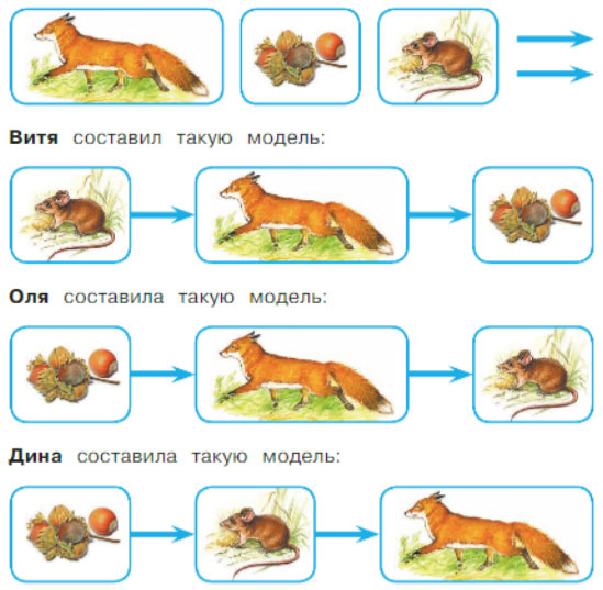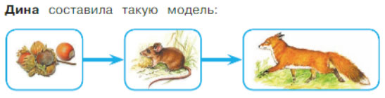 8. На деталях модели изображены: лиса, орехи, мышь. Мы уже знаем, что цепи питания начинаются с растений-производителей. А животные – это потребители. Значит, наша цепь питания начнётся с орехов. Орехи употребляет мышь, мышь идёт в пищу лисе. Цепь питания должна быть такой: орехи → мышь → лиса.