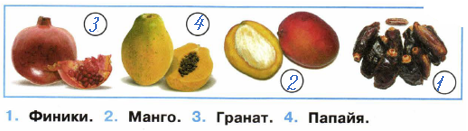 В жарких странах выращивают много замечательных фруктов. Вот некоторые из них. Знаешь ли ты их названия? Пронумеруй в соответствии со списком. Устно опиши вкус плодов, которые тебе доводилось пробовать.