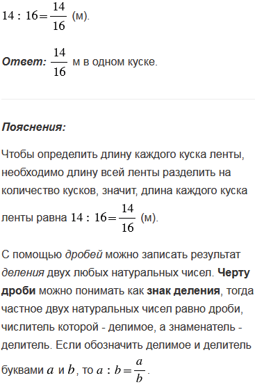 Ленту разрезали на 16 равных кусков. Сколько метров ленты в одном куске, если ее длина 14 м?