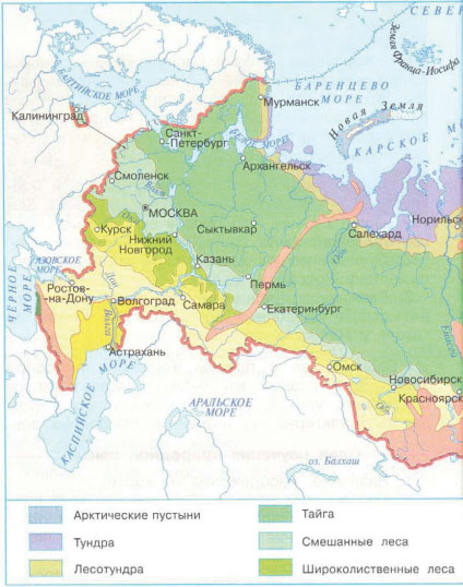 По условным обозначениям природных зон в легенде карты мы видим, что в России существуют следующие природные зоны: арктические пустыни, тундра, лесотундра, тайга, смешанные леса, широколиственные леса, лесостепи, степи, полупустыни и пустыни, субтропические леса, смешанные леса Дальнего Востока, области высотной поясности.