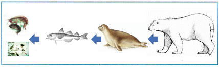 • Водоросли ← рачки ← сайка ← тюлень ← белый медведь.