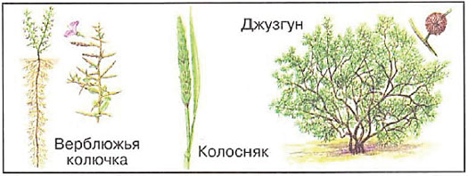 1. Рассмотрите в гербарии и на рисунке растения пустынь. Выскажите предположения, как эти растения приспособлены к условиям жизни в пустыне. Проверьте себя по тексту учебника.