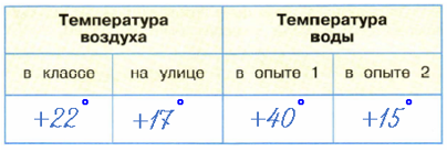 3. Пользуясь термометром, определи температуру воздуха, воды. Число градусов тепла записывают со знаком "+", а число градусов мороза – со знаком "–". Вместо слова "градус" ставится маленький кружочек. Например: + 10º, – 10º. Запиши показания термометра в рабочую тетрадь.