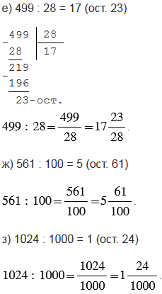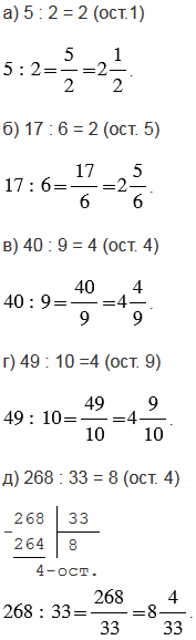 Деление можно заменить дробью, числитель которой - делимое, а знаменатель - делитель. Все дроби у нас получатся неправильные. Чтобы неправильную дробь, числитель которой нацело не делится на знаменатель, преобразовать в смешанное число, надо числитель разделить на знаменатель; полученное неполное частное записать как целую часть смешанного числа, а остаток - как числитель его дробной части.
