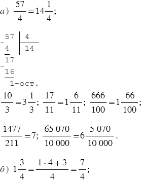 Чтобы неправильную дробь, числитель которой нацело не делится на знаменатель, преобразовать в смешанное число, надо числитель разделить на знаменатель; полученное неполное частное записать как целую часть смешанного числа, а остаток - как числитель его дробной части.