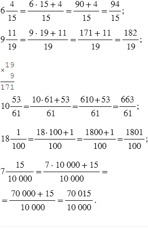 Чтобы преобразовать смешанное число в неправильную дробь, надо целую часть числа умножить на знаменатель дробной части и к полученному произведению прибавить числитель дробной части; эту сумму записать как числитель неправильной дроби, а в ее знаменатель записать знаменатель дробной части смешанного числа.