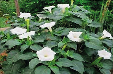 Цветок дурмана напоминает маленькую лилию. Цветочных лепестков всего пять. Бутоны распускаются бутоны только к вечеру.