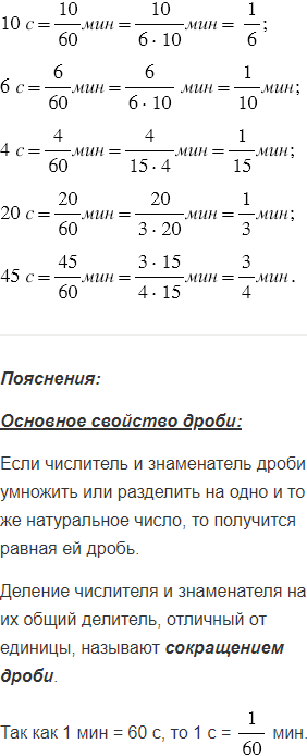 Какую часть минуты составляют 10 с, 6 с, 4 с, 20 с, 45 с?