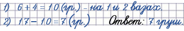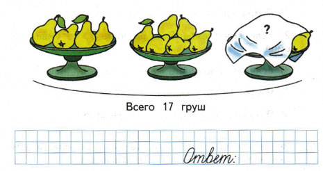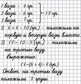 К празднику купили 17 груш и разложили их на 3 вазы. На первую вазу положили 4 груши, на вторую - 6 груш. Сколько груш положили на третью вазу?