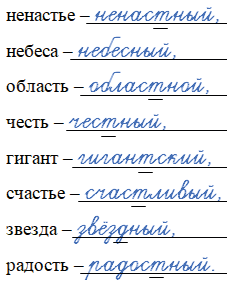 • Подберите к каждому слову и запишите однокоренное имя прилагательное.