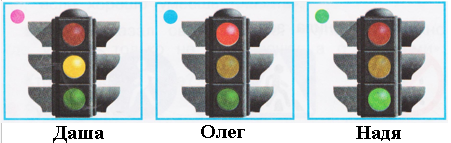 4. Ребята изготовили модель светофора. Олег зажёг на своей модели сигнал "Стойте!". Надя зажгла сигнал "Идите!". Даша зажгла сигнал "Внимание!". Где светофор Нади?