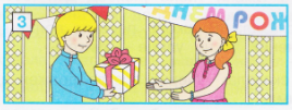 3. В третьей сценке мальчик дарит девочке подарок на день рождения. В ней прозвучит слово "Спасибо".