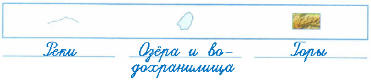 Находим на карте в учебнике водные объекты, равнины, горы.