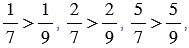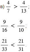 б) Из двух дробей с одинаковыми числителями меньше та дробь, у которой знаменатель больше, и больше та дробь, у которой знаменатель меньше.
